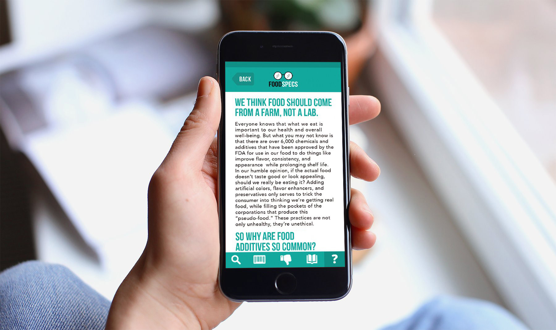 FoodSpecs is an app concept I developed as a way to inform the public about the potential dangers of artificial food additives. The app allows you to scan barcodes or search a database of FDA-approved food additives, providing consumers with descriptions, uses, and safety ratings for each substance.
